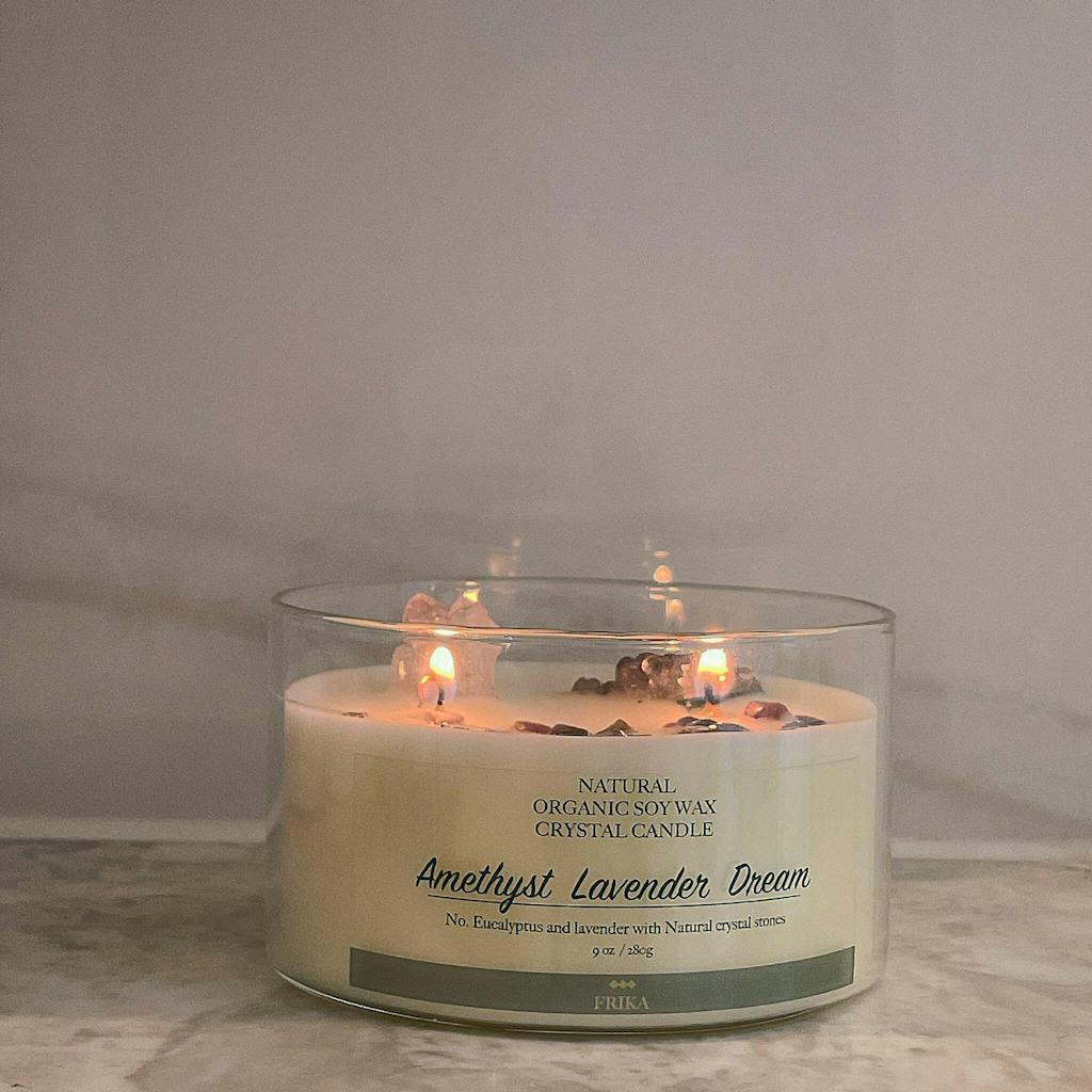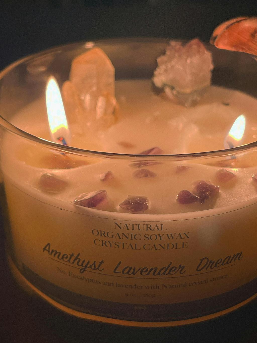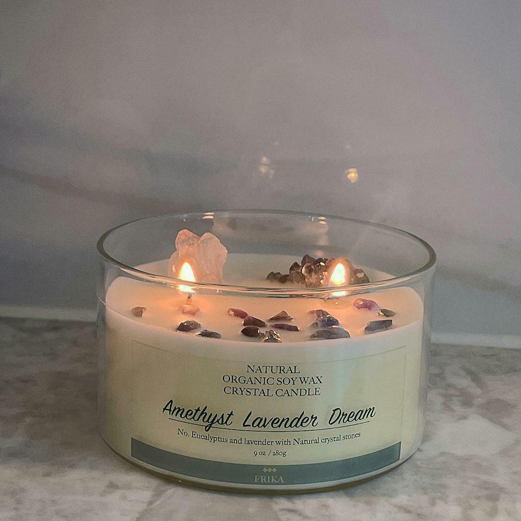 Amethyst Lavender Dream Natural crystal stone candle with Crystal bamboo clip 280g